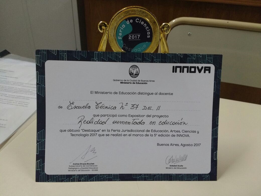 La E.T.37 "Hogar Naval Stella Maris" ha sido reconocida con una mención especial otorgada por las autoridades del evento por su proyecto "Realidad Aumentada: La aventura de Jacinta", el cuál otorga un valioso aporte a la enseñanza en diferentes áreas de la instrucción y aprendizaje de los niños en edad escolar.